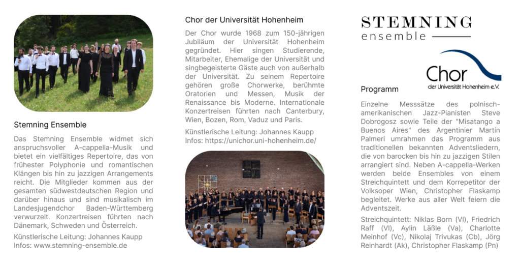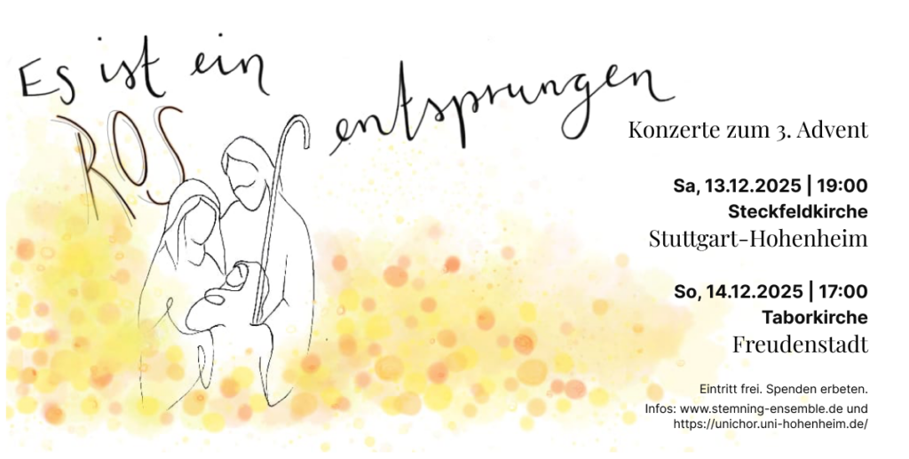 Das Stemning Ensemble und der Chor der Universität Hohenheim (Stuttgart) konzertieren unter dem Titel des adventlichen Programms “Es ist ein Ros entsprungen…”am 3. Advent, Sonntag, 14.12.2025 um 17:00 Uhr in der Taborkirche Freudenstadt unter der künstlerischen Leitung von Johannes Kaupp. Bei einigen Werken werden die beiden Ensembles von einem Streichquintett aus Freiburger und Stuttgarter Musikern sowie dem Korrepetitor der Volksoper Wien Christopher Flaskamp am Klavier begleitet.